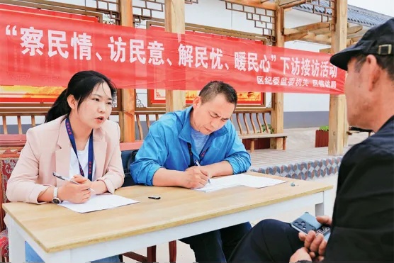 近年来,各地纪检监察干部深入基层一线开展下访接访活动,面对面倾听群众诉求,收集问题线索,持续整治群众身边不正之风和腐败问题。图为2025年5月27日,甘肃省定西市安定区纪检监察干部在香泉镇陈家屲村接访。 人民图片 陈永刚/摄