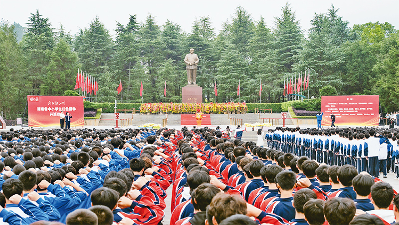 近年来,湖南以韶山为试点,打造“我的韶山行”红色研学品牌,创新思政教育模式,引导学生传承红色基因、坚定理想信念。图为2025年10月16日,“我的韶山行”红色研学开班仪式在韶山市毛泽东广场举行。 韶山思政教育实践中心供图